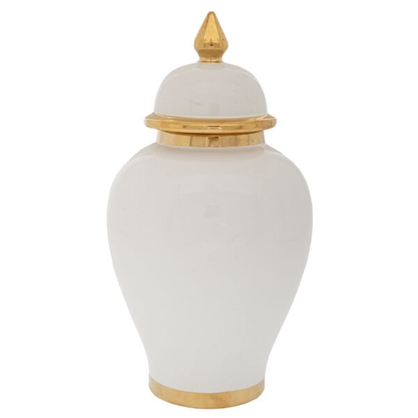 Λευκό κεραμικό βάζο με καπάκι και χρυσές λεπτομέρειες.